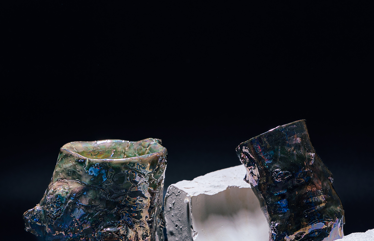 Initial Structures čerpá inspiraci z geologických procesů, jako je vulkanická činnost, eroze či vrstvení hornin. Tyto jevy se promítají do tvarů a povrchů objektů – do nepravidelností, struktur a lesků, které připomínají proměny zemské kůry.